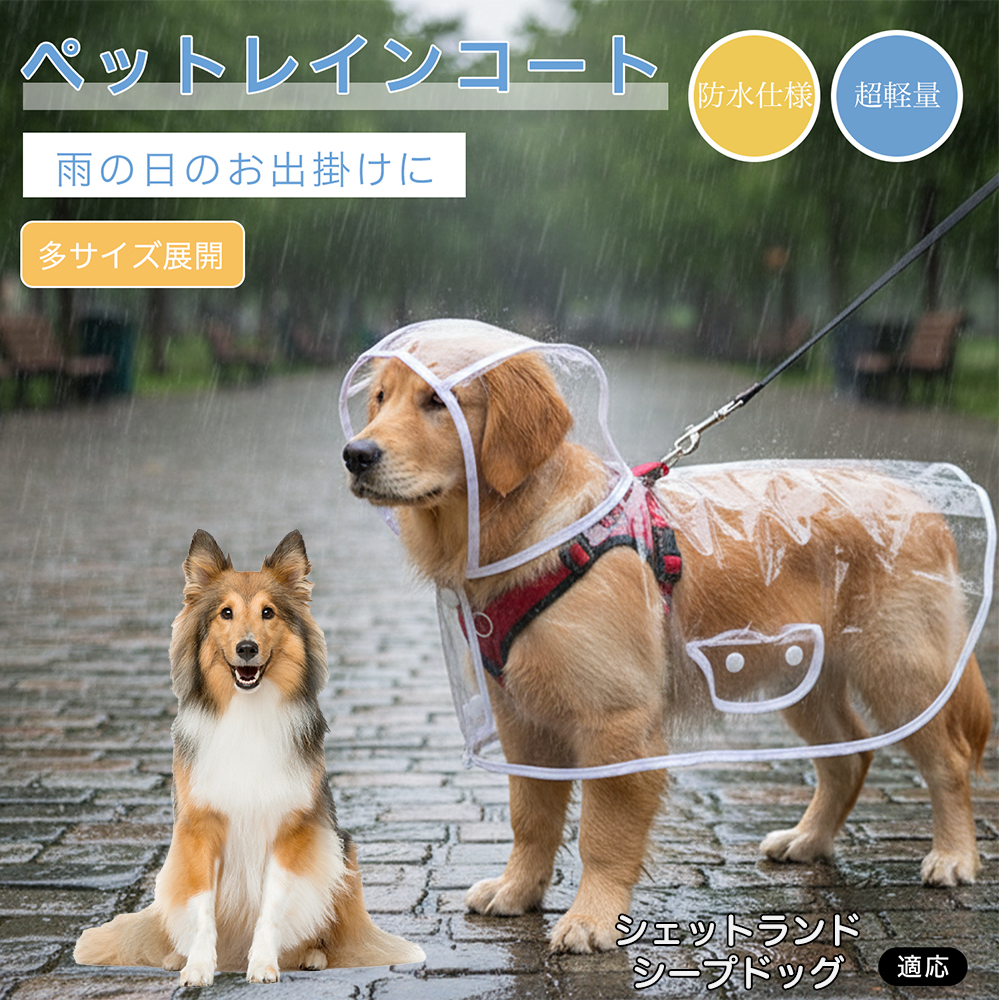 適応ペット シェットランドシープドッグ犬 シェルティ 商品説明:雨の日の散歩で濡れ・泥汚れを防ぐ、透明EVA素材の犬用レインコートです。透明デザインで視界を遮りにくく、軽量でやわらかい着心地。スナップボタン式で着脱しやすく、お腹まわりはゆったり設計でトイレの動作にも配慮。リード装着用の穴付きです。