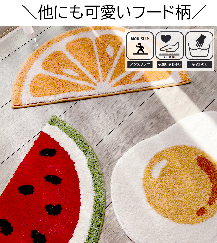 他にも、スイカやオレンジ、めだまやき柄の変形マットも♪