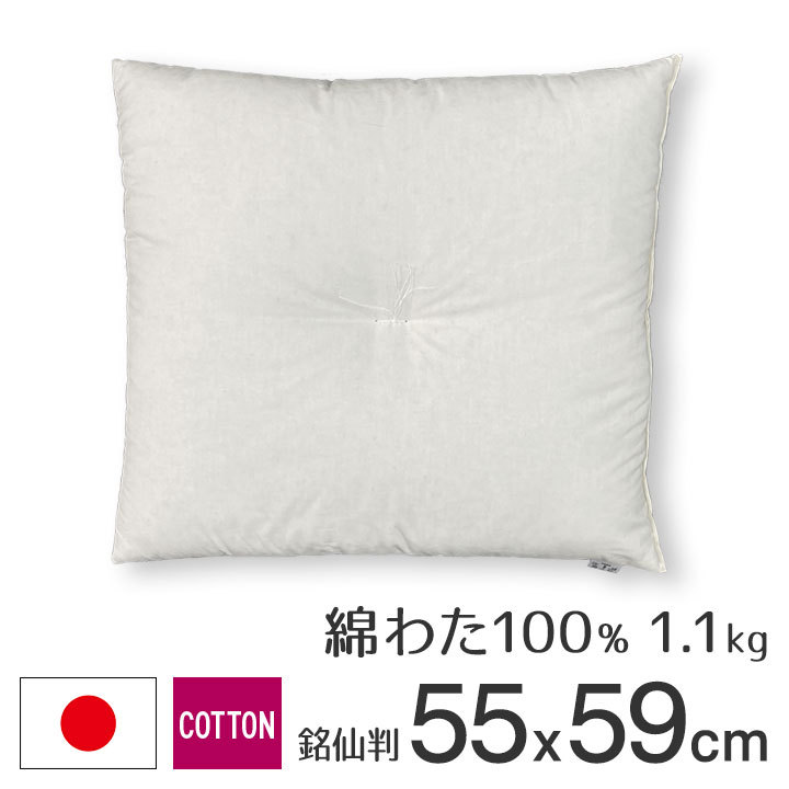 銘仙判(55cm×59cm)の大きさで、中わたはコットン100%を使用しています。ポリエステルわたと違い、座布団本来のしっとりとした座り心地です。