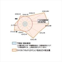 マルチビタミン1日1粒総重量525mg(内容量350mg)あたりナイアシン15mg、パントテン酸9.2mg、ビオチン45μg、β-カロテン〈ビタミンA効力1,500IU〉5400μg、ビタミンB1 2.2mg、ビタミンB2 2.4mg、ビタミンB6 3.2mg、ビタミンB12 6μg、ビタミンC 100mg、ビタミンD<ビタミンD3>〈200IU〉5μg、ビタミンE(d-α-トコフェロール)10mg、葉酸200μg、ビタミンP 20mg