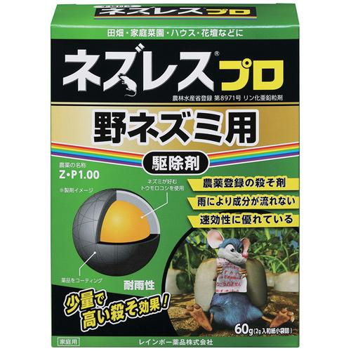 在庫状況:お取り寄せ/7日〜10日で出荷/※仕様及び外観は改良のため予告なく変更される場合がありますので、最新情報はメーカーページ等にてご確認ください。◆田畑、花壇、ビニールハウスを含む農耕地で使える農薬登録の殺そ剤です。◆クマリン系殺そ剤に比べ、少量で高い殺そ効果を発揮します。◆本剤を食べたネズミは急性中毒を起こし、3〜5時間で死にいたります。◆速効性に優れているため、ネズミに薬剤の耐性がつきません。◆本剤を食べて死んだネズミを他の動物が食べても、その動物が中毒になることはありません。◆基材にネズミが好むトウモロコシを使用しています。◆雨が降っても成分が流亡しません。【上手な使い方】◆手袋をはめ、ビニール袋から分包を取り出しそのまま配置するか、または分包から粒を出し適宣配置します。◆農地の外辺部に本剤を配置すると、新しいネズミの侵入を防いで駆除効果が一段とあります。◆被害および生息数が多い場合は、15〜30日おきに数回防除してください。【安全使用上の注意】◆作業中は直接手で触れないようにし、手袋を使用する。作業後は必ず手をよく洗っておく。◆食品類、家畜、鶏などの飼料と混ざらぬようにする。ま