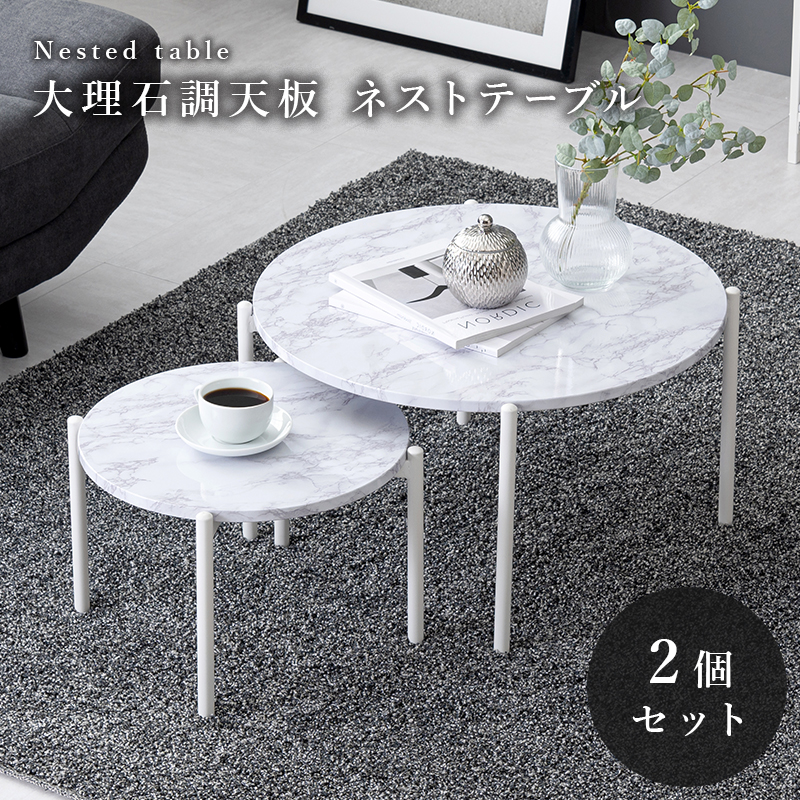 在庫状況:お取り寄せ/お届け:1〜2週間/2022年07月 発売/■外箱について配送中に外箱に汚れや傷が生じる場合がございます。誠に申し訳ございませんが、外箱のみの汚れや傷による商品の交換や返品は受け付けておりません。(商品に破損・欠品があった場合は、その限りではございません。)◆モダンな雰囲気の大理石調天板を使用したテーブルセット。◆丸型2個セット。・テーブル大(約):幅64×奥行64×高さ34cm・組立:お客様組立/[LT4666MWH]