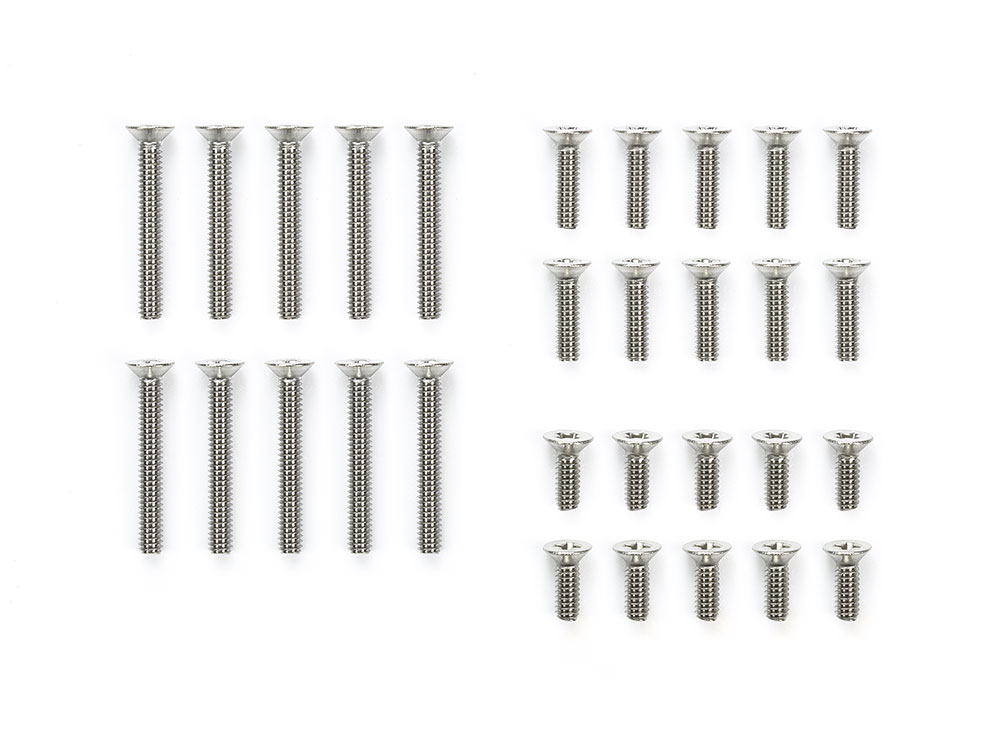 ビスの頭が平らな皿ビスのセットです。シャーシ裏面に取り付けるプレートなどに皿穴加工をすればビスの頭が飛び出ることがなく、スムーズな底面に仕上げられるので、ビスが路面に接触するのを防ぎます。