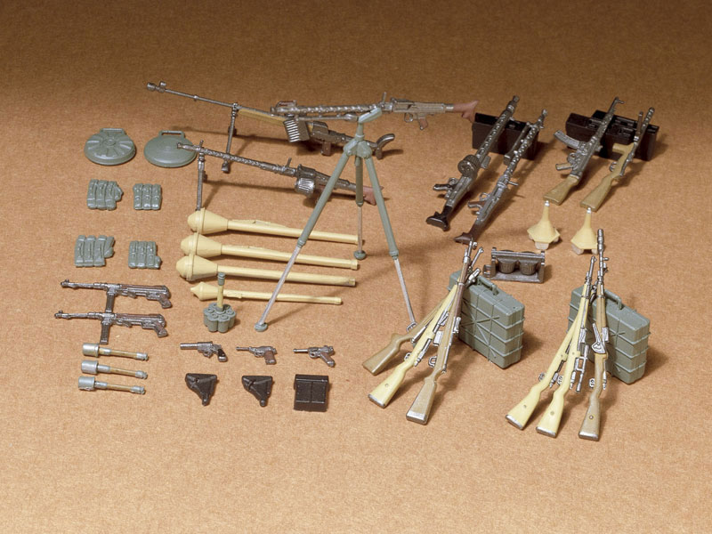 ルガーP08やワルサーP38などのピストルやKar98K小銃やワルサーG41自動銃、MP40短機関銃やMP44突撃銃、Pz.B.39対戦車ライフル、MG34やMG42機関銃、そして対戦車兵器のパンツァーファウストや磁力地雷まで約20種類各2個をセット。