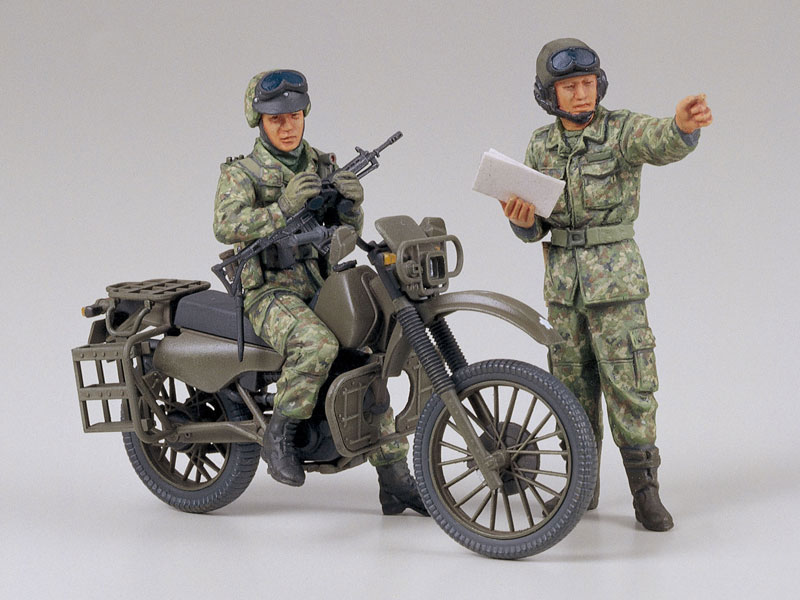 陸上自衛隊偵察部隊のオートバイ、そして偵察部隊員と戦車乗員の人形各1体のセットです。