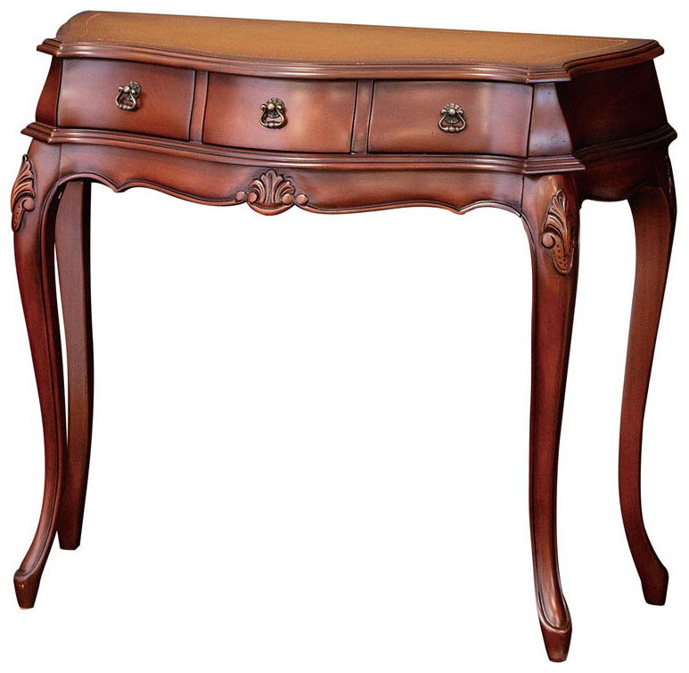 在庫状況:お取り寄せ/7日〜10日で出荷/【お客様組立】●天板は高級感のあるレザー調の特殊な仕上げ●ネコ脚、手彫り仕上げ、引出内部の底はフェルト貼りなど、細部にまで工夫を凝らしております◆サイズ(約):幅90×奥行41×高さ77cm ◆引出内寸(約)左・右:幅16.5×奥行18.5×高さ7cm/中央:幅16.5×奥行23×高さ7cm ◆重量(約):11.5kg ◆材質:前板・脚は天然木、天板は中質繊維板、側板は天然木化粧合板、ラッカー塗装/[28577クロシオ]