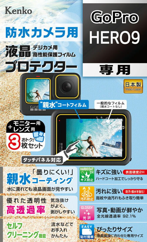2020年10月 発売曇りにくく、水に濡れても液晶画面が見やすい親水コーティング採用の防水カメラ用液晶プロテクター◆親水コーティングで曇りにくく、水に濡れても液晶画面が見やすいフイルム表面に超親水性機能つき防雲コーティングを施し、曇りにくく、水に濡れた際の液晶画面の見やすさを実現しました。