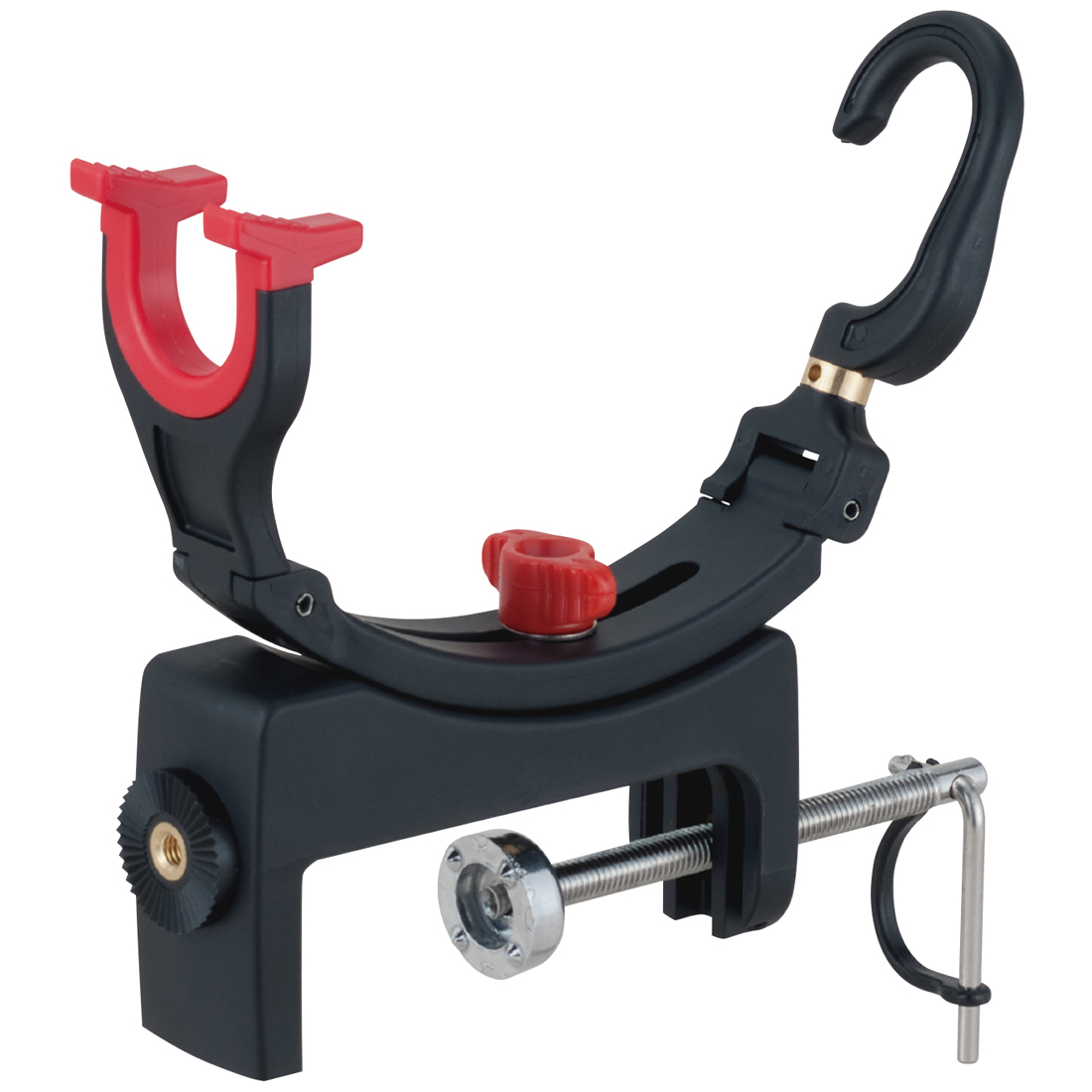 角度調節は赤セットネジを緩め、竿受部を前後・左右の好みの位置に調節後、赤セットネジを締め付けて下さい。