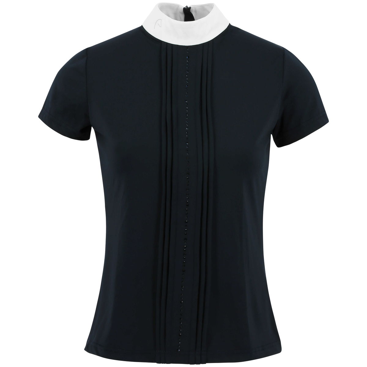 4WAYストレッチと軽量、速乾素材で、最高のパフォーマンスをサポート。シルバーの馬ロゴと胸元のラインストーンが、競技場での装いをエレガントに格上げする高機能ショーシャツ。