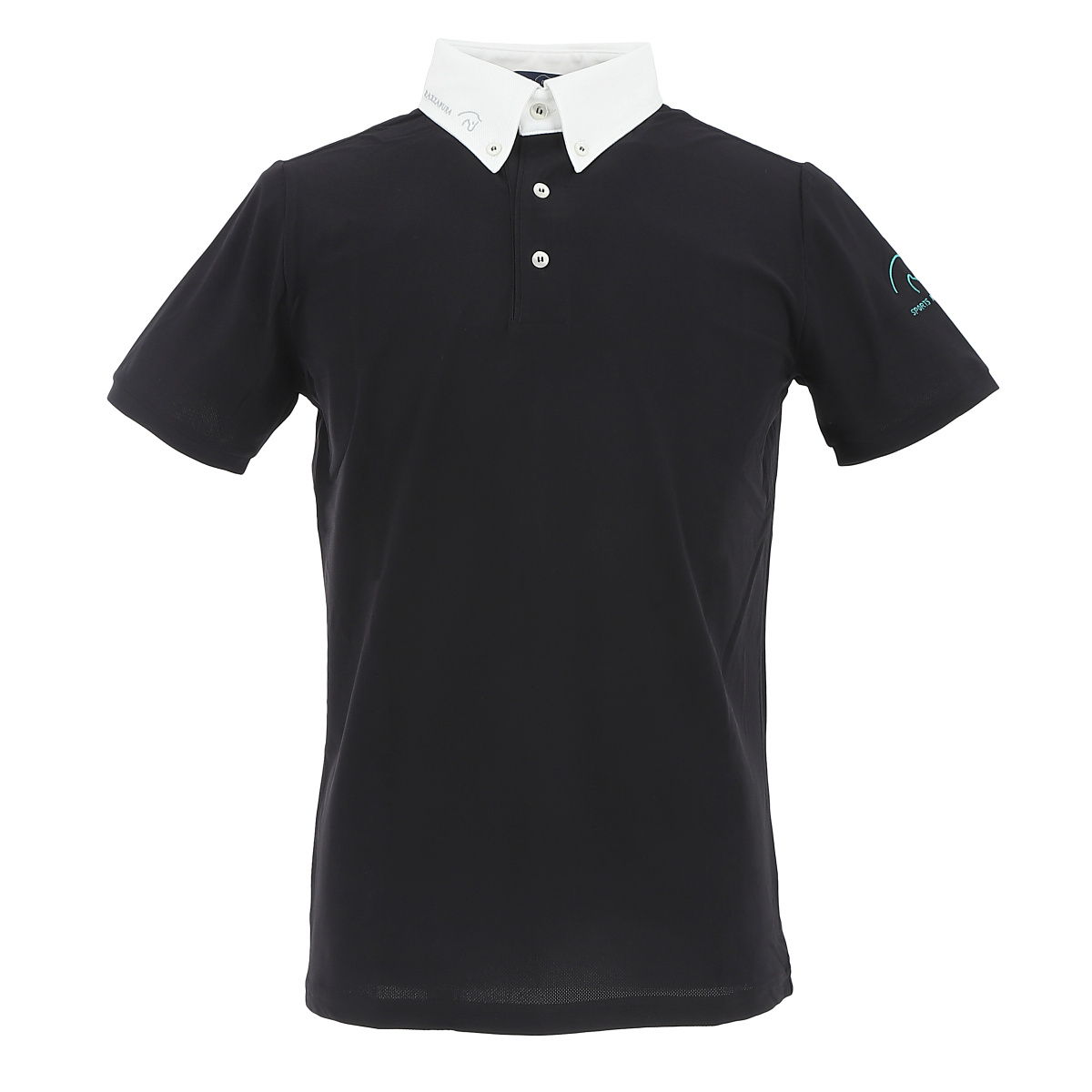 通気性と動きやすさを備え、競技会からカジュアルなシーンまで幅広く対応。ロゴ入りの袖がさりげないアクセントに。白のボタンダウンカラーが印象的な半袖ショーシャツ。