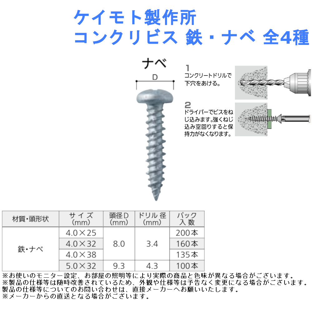 軽量物 コンクリート ねじ インターホン DIY リフォーム 施工 便利 ケイモト製作所 コンクリビス 材質・頭形状:鉄・ナベ 全4種