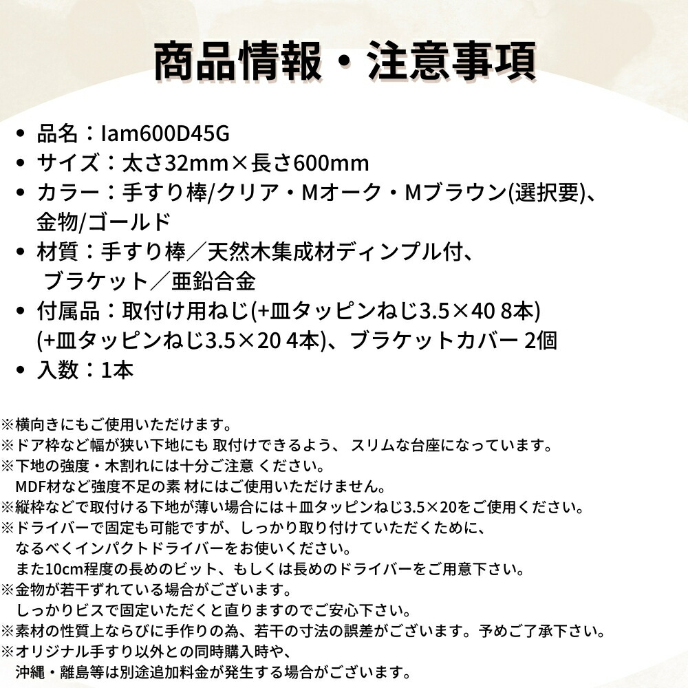 木製手すり 600mm I型 縦横兼用 スリム角用 コーナー対応 出隅対応 ディンプル加工 Iam600D45G ゴールド金具 全2色 玄関 トイレ 室内用