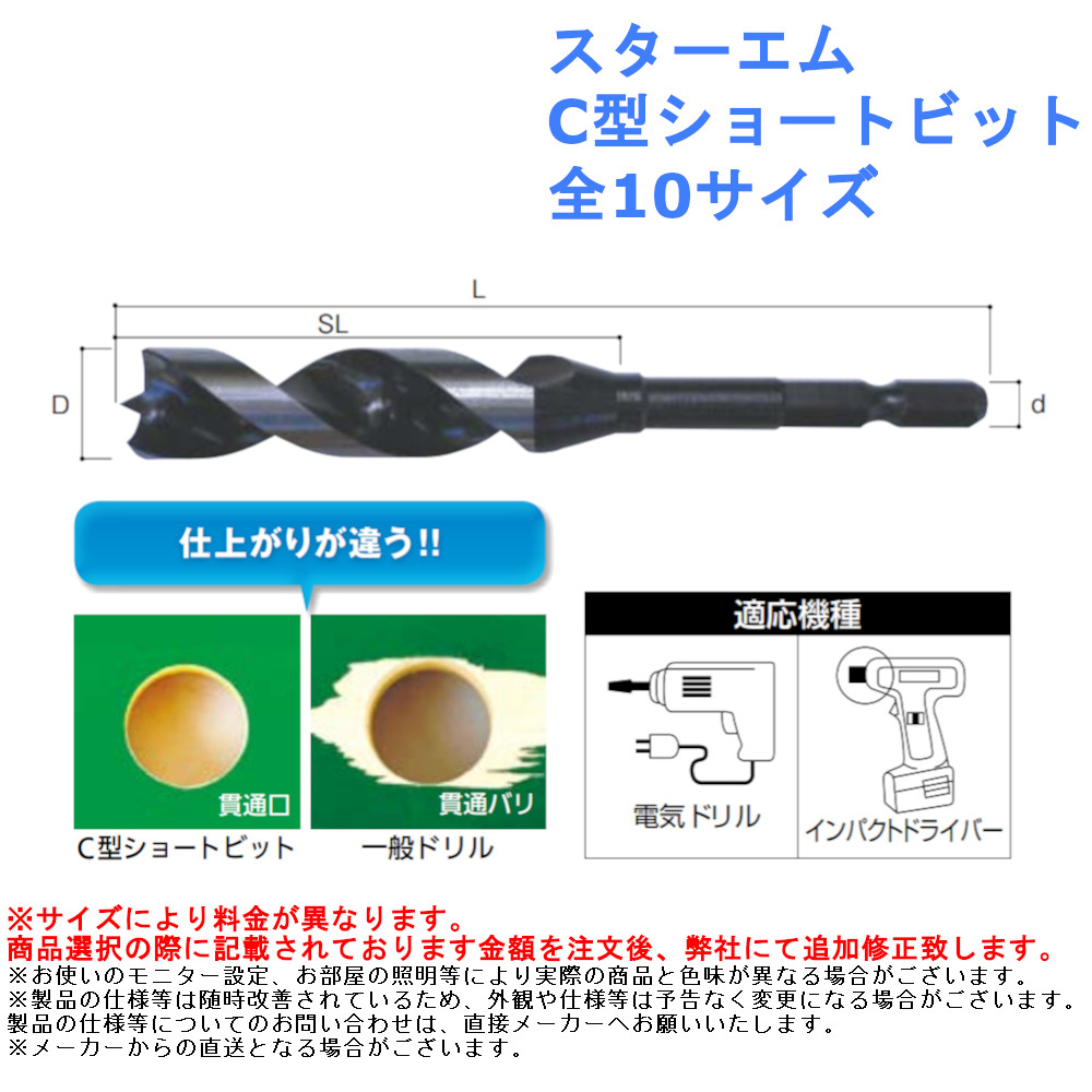 貫通 穴あけ 下穴 インパクトドライバー ドリル 電動 電気 ツール 道具 工具 スターエム C型ショートビット 全10サイズ
