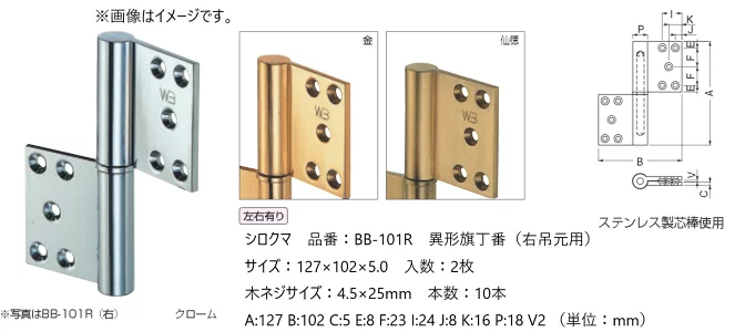 シロクマ 白熊印 丁番 ステンレス 異形旗丁番 品番:BB-101R(右吊元用) サイズ:127×102×5.0mm 入数:2枚 全3色