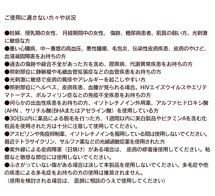 Q: ケアの際の肌への刺激はありますか?A: 出来る限り肌への刺激をカットした設計で、敏感肌の方でも安心してご利用いただけます。初めてご使用の部位はLV1からお試しいただくことをおすすめいたします。