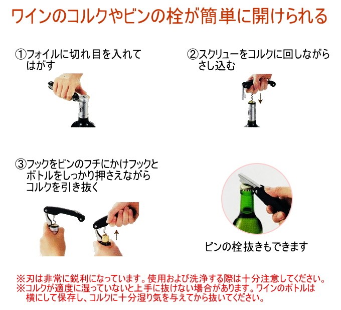 ワインのコルクやビンの栓が簡単に開けられます。
