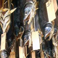 | 塩引き鮭の作り方ですが、水揚げされた鮭からまず内臓やエラを取り出します。続けて長期間保存できるように荒塩をすり込みます。数日間から1週間ほど置いた後、水で塩抜き、軒下などで寒風にさらします。この時期の村上では、至るところで吊り下げられた塩引き鮭を見掛けることができ、冬の村上の風物詩になっています。 ちなみに頭を下にするのは村上独特の吊り下げ方。城下町だった村上では、鮭でさえもお殿様に頭を高く出来なかった、というのがその理由と言われています。 鮭が上ってくる三面川(みおもてがわ)は朝日連峰にその源を発し、越後平野の北端村上市を経て、日本海に注ぐ美しい川です。今から二百数十年前の幕藩時代、文化5年(1808年)村上藩士、青砥武平治によってサケの回帰性が発見され、「種川の制度」が考案されました。「種川」とはサケのそ上・孵化を容易にするためのいわば保護河川のことで、日本で最初の鮭の増殖法となりました。 明治11年の人口孵化成功にともない、三面川の鮭漁はますます盛んになり現在に至っています。越後村上の美味しい塩引鮭、ぜひご賞味ください。 |