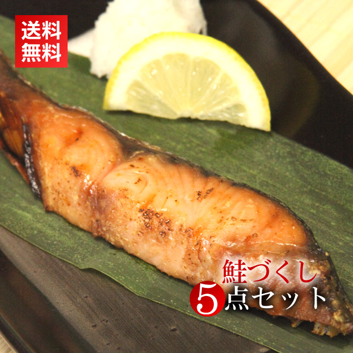 | 商品名 | 鮭づくし5点セット 【セット内容】 塩引き鮭 3切入/鮭の焼漬 4切入/鮭の味噌漬 4切入/鮭茶漬け 80g/塩引き鮭 カマ |