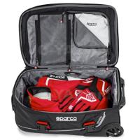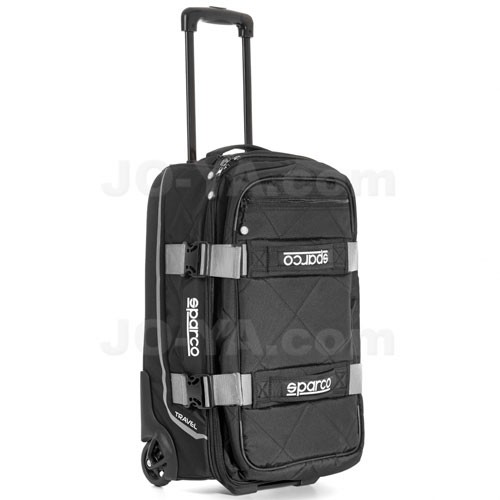 キャスター、キャリーハンドル付きの大型キャリーバッグsparcoトラベル。レーシングスーツやレーシングシューズなどの装備品をスッキリと収納出来る大型バッグです。レース遠征はもちろん、3泊4日程度の旅行に最適です。高密度ポリエステル製により、丈夫で防水性も高く、パソコン保護用のプロテクションも備え、旅行から日常使用間までシーンを選ばない多機能さを誇ります。