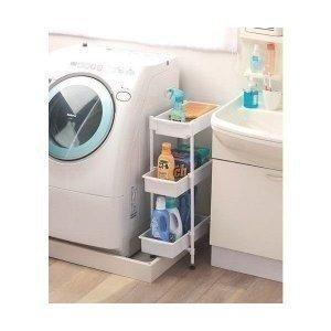 洗濯機やキッチンまわりの用品をスリムにすっきり収納できるサイドラックです。アジャスター付きで、洗濯機の防水パンをまたいで設置できます。また、引出しがプラスチックトレーなので、洗剤や小物などが下に落ちる心配もありません。