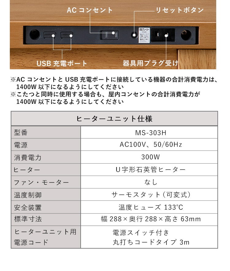 ※こたつと同時に使用する場合、屋内コンセントの合計は1400Wまででご使用ください。