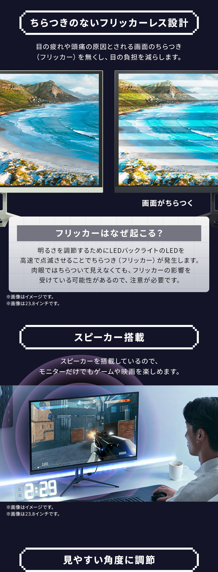 明るさ調節のためのLEDバックライトの高速点滅(ちらつき)を抑えた、フリッカーレス設計です。