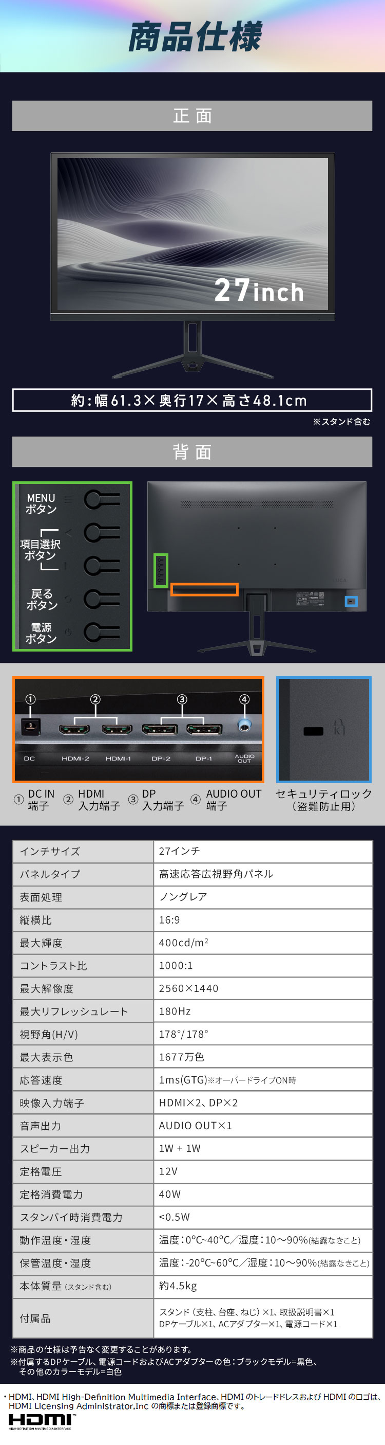 (検索用:モニター ゲーミングモニター 27インチ wqhd 180hz pcモニター ゲーミング ブラック ホワイト ピンク ブルー パソコンモニター 新品 液晶 ディスプレイ 高速応答 広視野角パネル ノングレア アーム取付可 ゲーム 4967576817677 4967576817684 4967576817691 4967576817707 4967576817714 4967576817721 4967576817738)