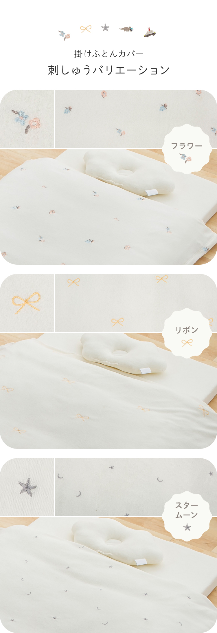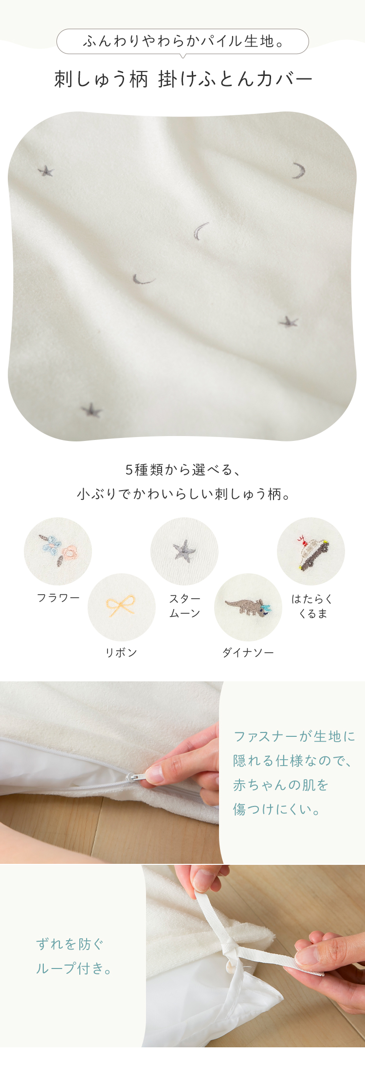 布団カバー、フィットシーツ、枕の生地は綿100%(パイル部分)生地を使用しており、掛けカバーには可愛い刺繍入り。