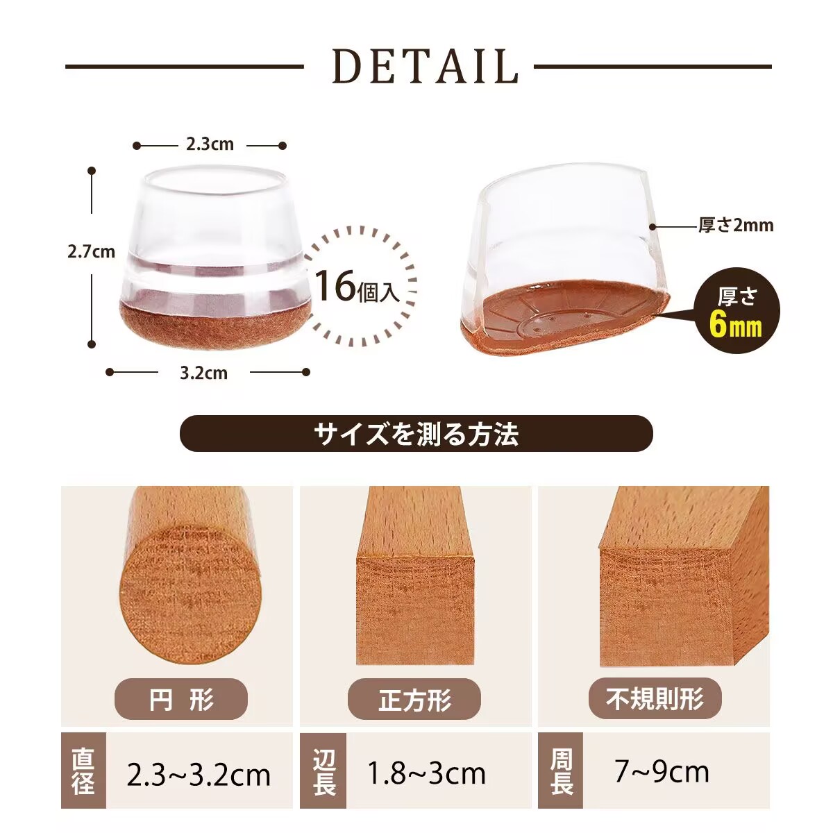 この椅子脚カバーは、さまざまな形状の椅子脚に対応しています。例えば、長方形の椅子脚(の片辺の長さが2.6-3.6cm)、円形の椅子脚(の直径が3.1-3.6cm)、不規則な形状の椅子脚(の周囲が9-11cmです)。テラスの椅子、キッチンの椅子など、さまざまな種類の椅子に使用できます。