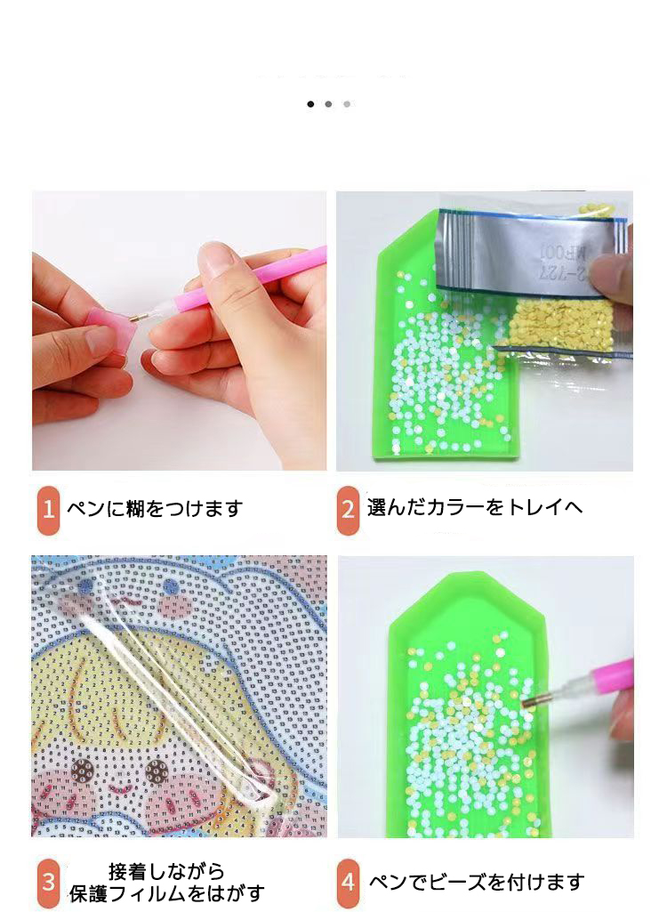 シンプルで誰でもできる工程:キャンバスには番号がプリントされており、対応する色の「ダイヤモンド」を専用ペンで貼っていくだけ。細かい絵心や技術は不要です。