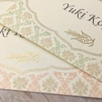 1.幸せの象徴である鳩と文字周りを上品な金箔で表現。アラベスク模様との調和が素敵な席札。