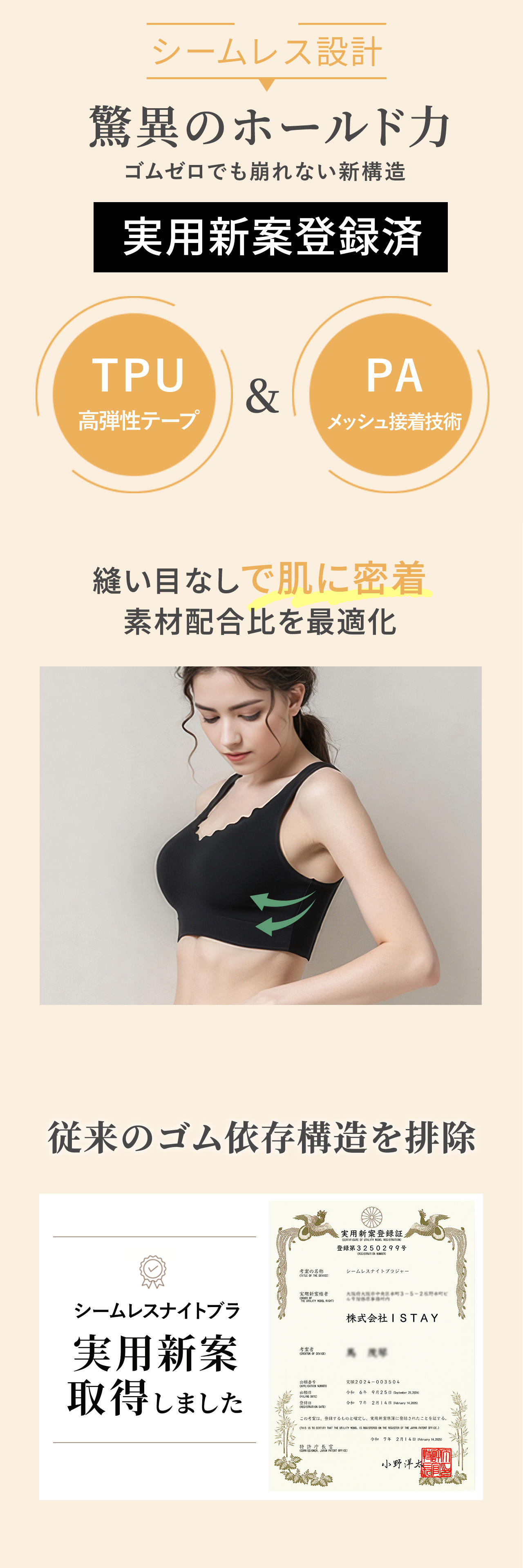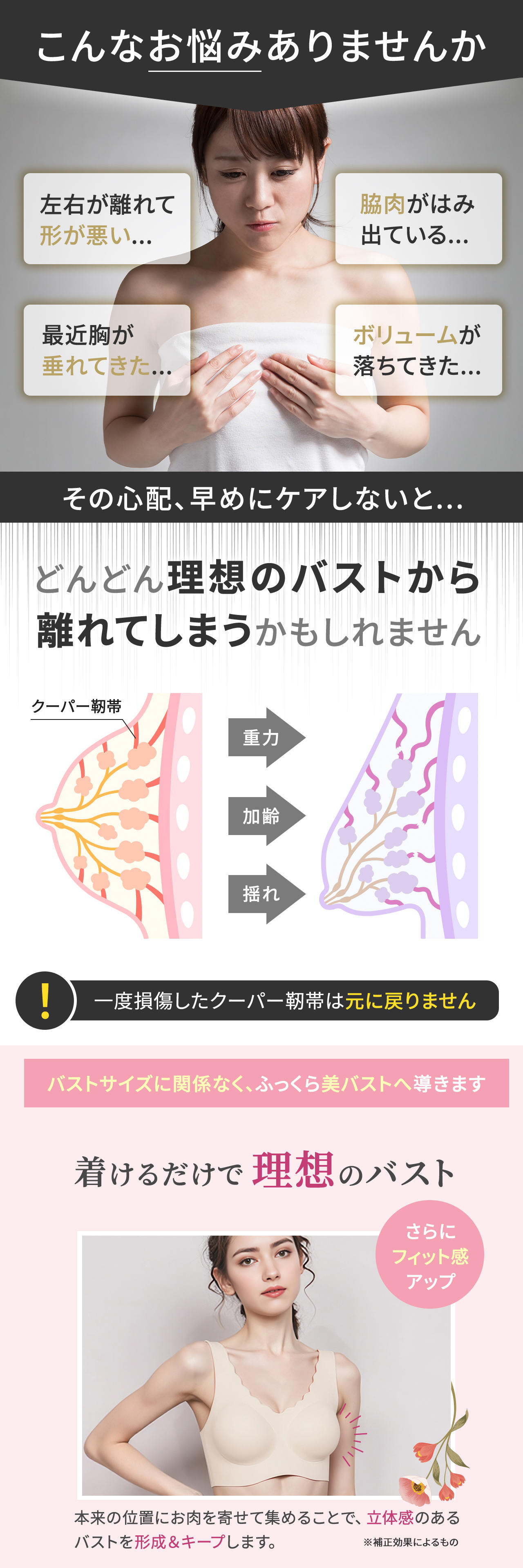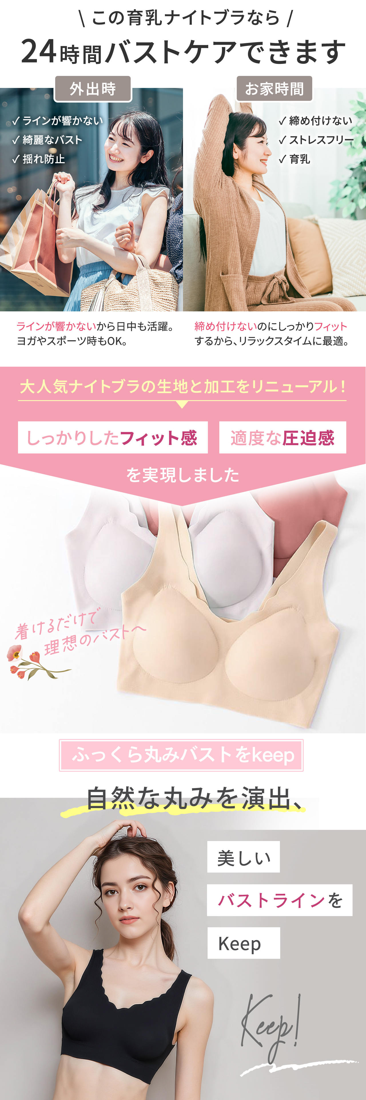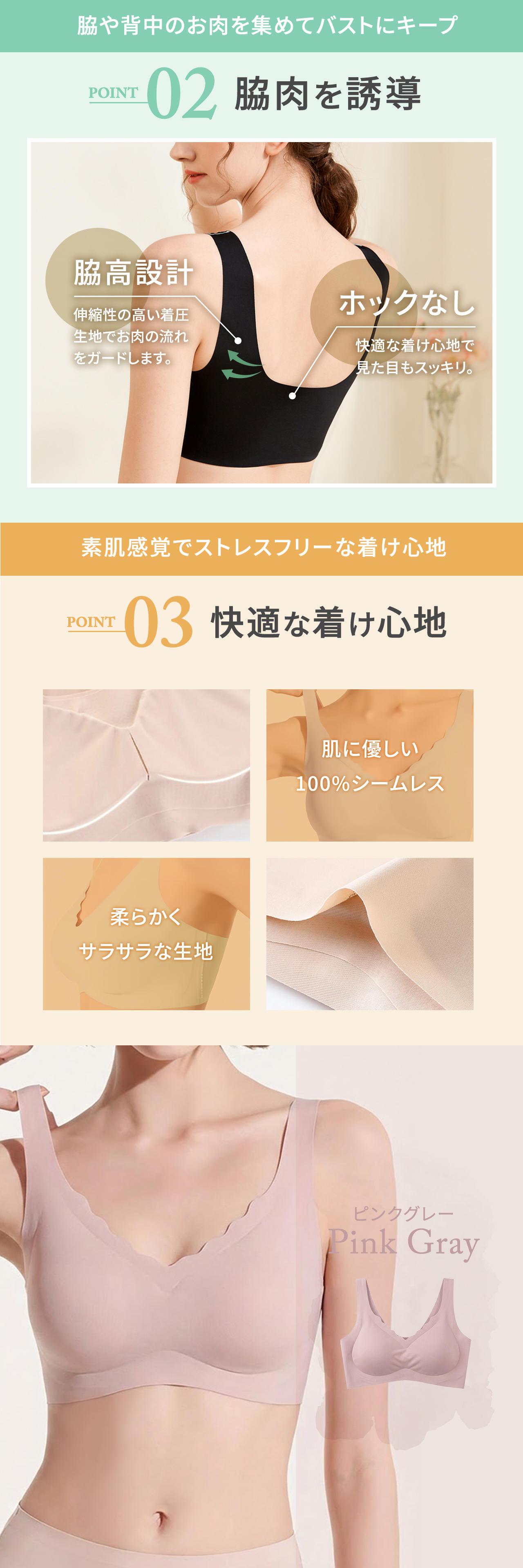 下着のラインが出やすいトップスを着る際にも段差が出ないので、オススメです。バストをきれいに丸く整えるモールドカップ付きなので、ナイトブラに抵抗がある方にもオススメです!