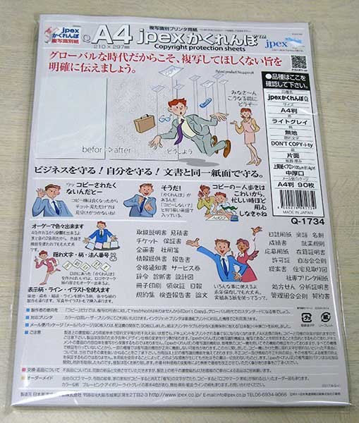 偽造改竄防止の為に「DON’T COPY」の隠れ文字を配置しています。隠れ文字はクッキリと現れるように描画して作製しておりますが、コピー機の種類や設定によって隠れ文字の現れ方がかわります。尚全てのコピー機によるテストを行っていない事から隠れ文字が現れないといった事や、この用紙を使った事による如何なる損害が生じても、弊社は一切の責任を負う事は出来ませんので御了承ください。情報の大切さを社内に徹底させる為にも精々ご利用下さい。レーザー・インクジェットプリンタの何れにも使えます。プリンタトラブルの少ない上質紙中厚口 0.1mm厚を使用しています。