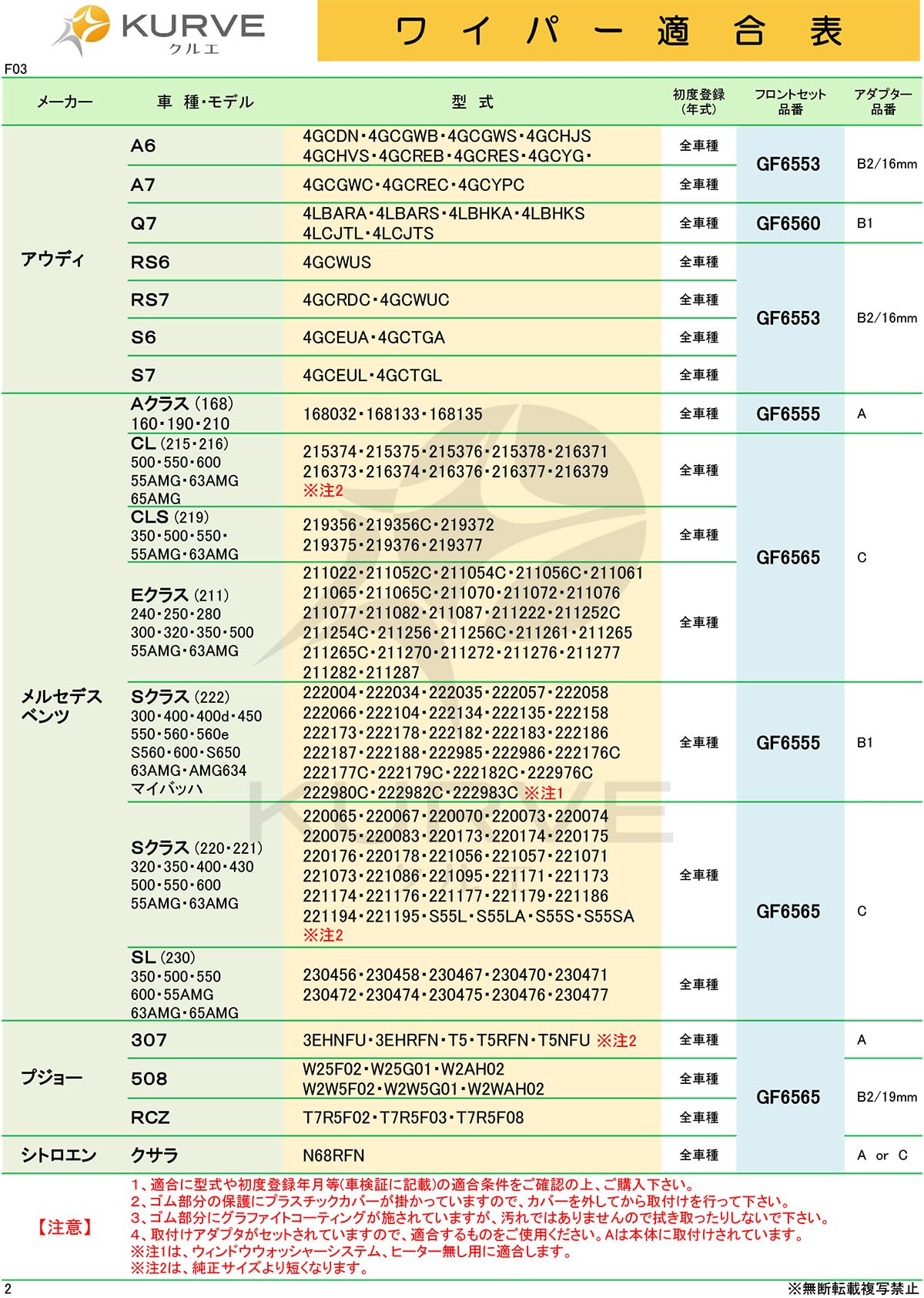●本適用表は、2023年(令和5年)12月末日現在のものです。従い、それ以降の車両につきましては、現在装着されているワイパーの形状、サイズ等をご確認の上、お選びください。