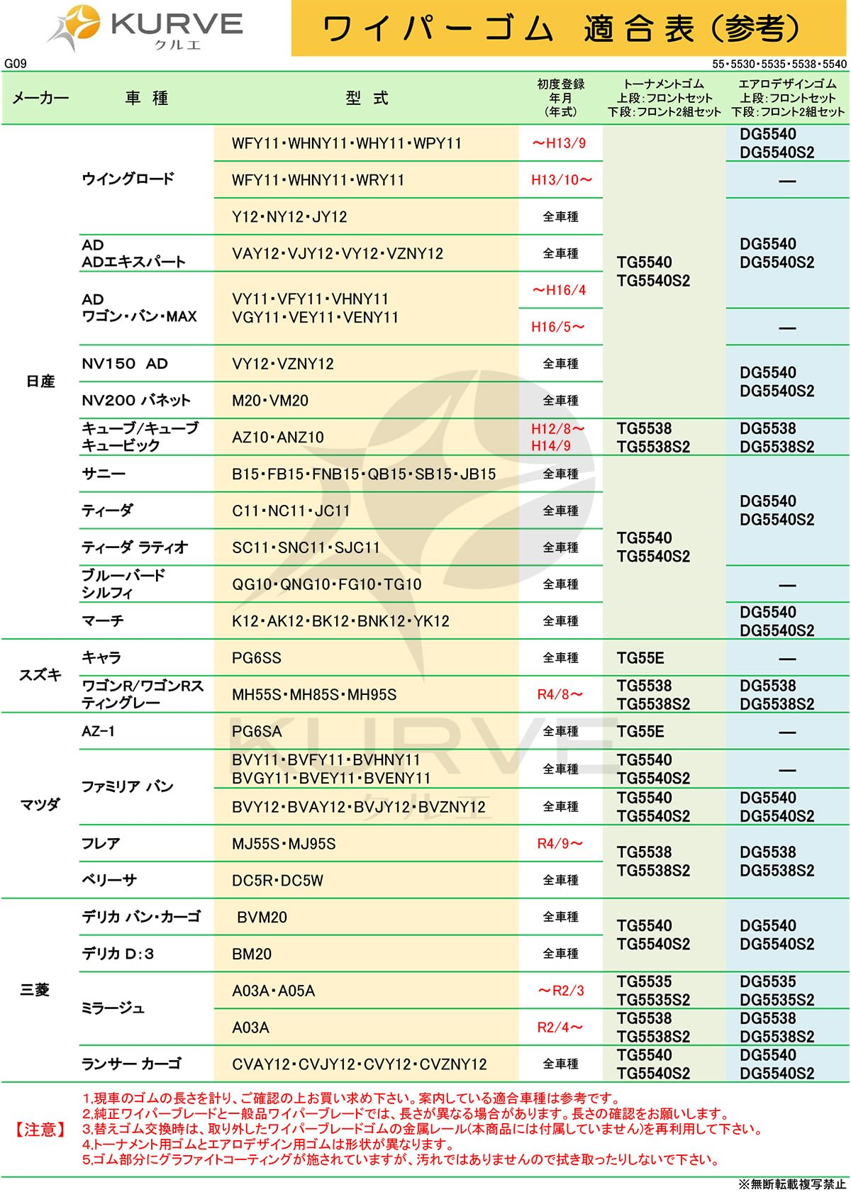 ●本適用表は、2023年(令和5年)12月末日現在のものです。従い、それ以降の車両につきましては、現在装着されているワイパーの形状、サイズ等をご確認の上、お選びください。