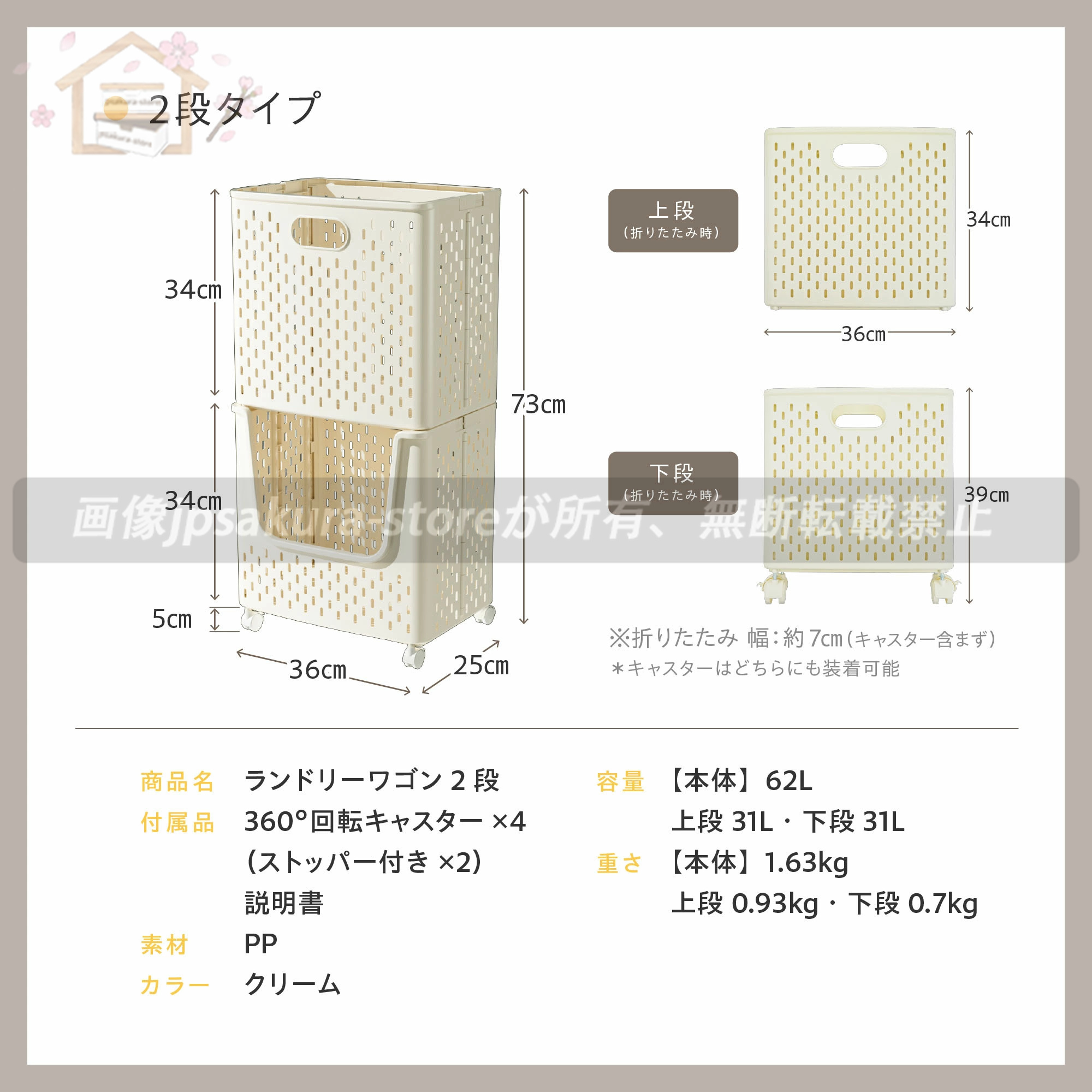 S:(展開時)34x22x48 (収納時)34x7x48 (容量)36L約