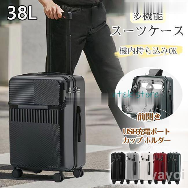 スーツケース 38L 機内持ち込み 前開き フロントオープン 軽量 USB充電 キャリーケース カップホルダー 多収納ポケット 5カラー選ぶ 旅行