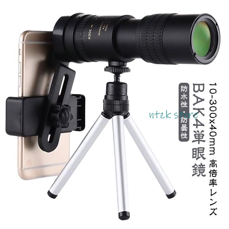 単眼鏡 望遠鏡 スマホに簡単装着 スマホカメラレンズ 10-300x40軍用望遠鏡-4K 高倍率 ズーム式 高解像度 三脚付き 3点セット 防水霧 耐
