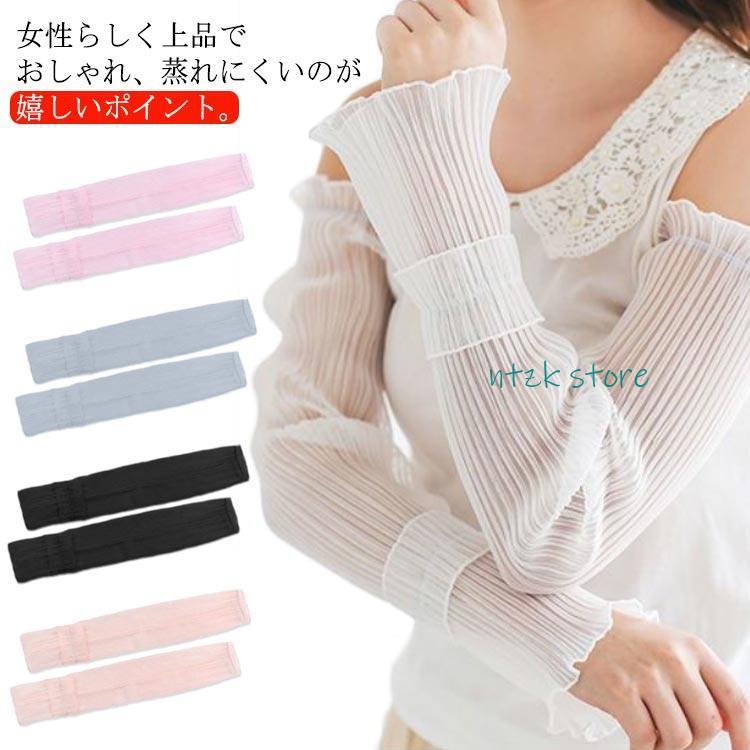 UVカット アームカバー 日よけ おしゃれ 運転 バイク 可愛い リボン レース シフォン 冷感 ロング スポーツ 涼しい 速乾 冷房対策 指あり ク