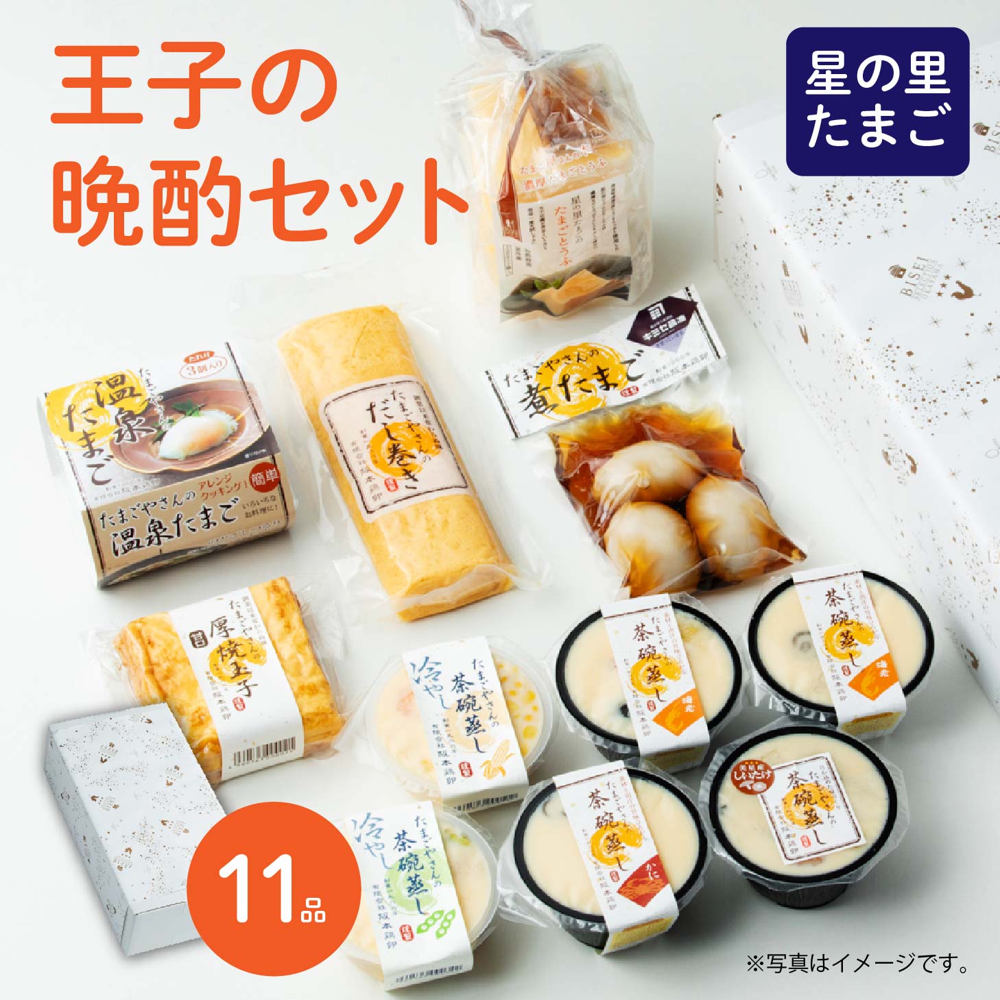 | 内容量 | 【 茶碗蒸し】150g×6 【たまご豆腐】120g×3 【厚焼き玉子】220g×1 【だし巻き卵子】250g×1 【温泉たまご】3個入り×1 【煮たまご】3個入り×1 |