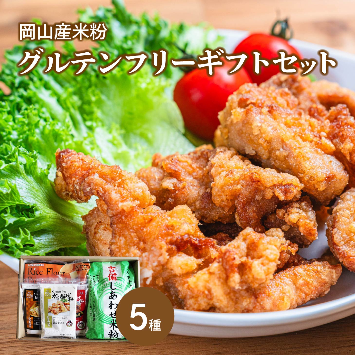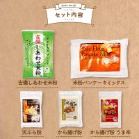 | セット内容 | 吉備しあわせ米粉1kg×1 米粉パンケーキミックス(200g×3)×1袋 から揚げ粉100g×1 から揚げ粉(旨辛)100g×1 天ぷら粉110g×1袋 |