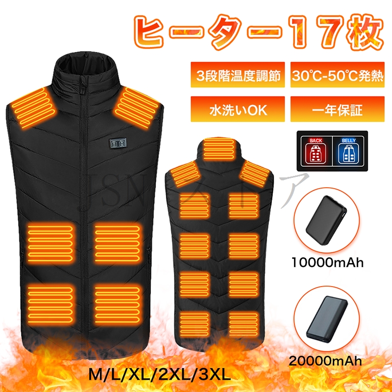 電熱ベスト 17箇所発熱 10000mAh/20000mAh バッテリー選択可能 前後独立温度制御 3段階独立調温 ヒーター付きベスト 電熱ウェア 防寒着 レディース 暖房ベスト