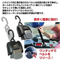 ボートのトランサムハンドル(アイ)等にフックを掛けラチェットで巻いて固定します。