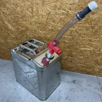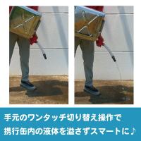 独自の設計で高価な車両・グラフィック・地面や海面に燃料がこぼれるのを防ぎ、消防法に適合したステンレス携行缶に取付することによりワンタッチで給油量が調整可能。