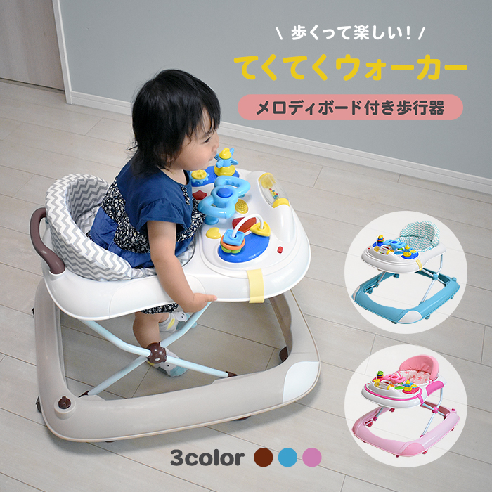 てくてくウォーカーは「歩くって楽しい!」と思える機能がたくさん詰まった歩行器です。活発な動きもしっかり受け止める丈夫なフレームと、集合住宅でも安心な消音キャスターで安心して歩行練習ができます。メロディボードは音楽が流れたり、おもちゃが付いているので、一人遊びの練習にもなります。メロディボードを外せばテーブルとしても使えます。テーブルにはコップ置きや、フチがあるので食べ物や飲み物がこぼれにくいです。食事中やちょっと動いてほしくないときに便利なストッパーを装備。ふんわり柔らかいシートは汚れたら手洗いできるので清潔に保てます。座面の高さを3段階で調節できるので成長に合わせて最適な状態で歩行練習が行えます。小さく折りたためてコンパクト(高さ28cm)になるので、使わないときは手軽に収納できます。