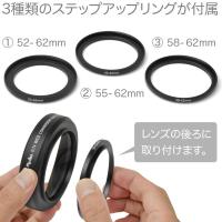 付属品 | レンズ本体、フロントキャップ、リアキャップ、収納ケース、レンズクリーニングクロス、取扱説明書(保証書付)、ステップアップリング3種類(62mm-52mm、62mm-55mm、62mm-58mm) |