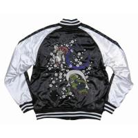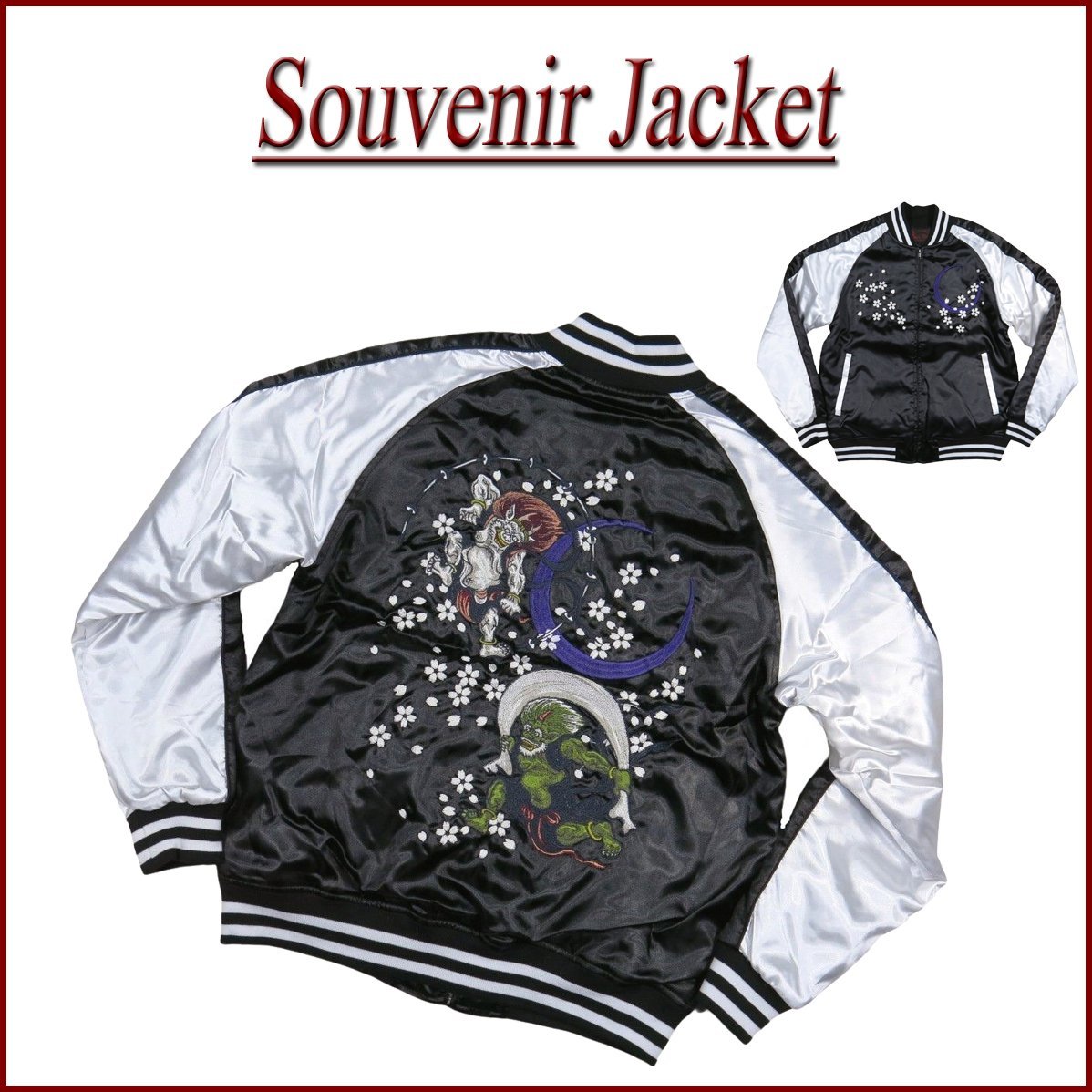 新品未使用 風神 雷神 舞桜 総刺繍 サテン地 中綿入り 和柄 スカジャン スーベニアジャケットです!軽めのアウターとして使い勝手のよい中綿入りのサテン地スカジャンです。2本ライン入りのリブ襟です!前身には月と桜の刺繍が施されています!袖口はリブ仕様、締め付け感は比較的少なめです。オーソドックスなハンドポケットが付きます!袖にはボディと同色のラインが入り、ラインの縁にはパイピング処理が施されています!身頃・袖裏ともにダイヤキルト仕様 、軽めの中綿で適度な保温性を保ちつつモコモコし過ぎないスマートなシルエットが魅力です!上品な光沢感が良い雰囲気を醸し出すサテン地を用いています。裏地も滑りが良くスムーズに着用していただけます! 風神・雷神、月、舞桜が大きく刺繍されたバックデザイン、迫力・存在感のある仕上がりになっています!リーズナブルながらも細かな刺繍を施すなどコストパフォーマンスの高さが魅力の1品です!
