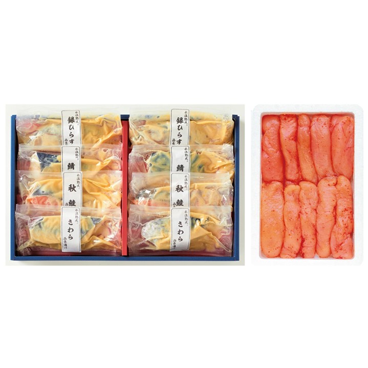 内容:さわら西京漬け70g・銀ひらす西京漬け60g・鯖西京漬け60g・秋鮭西京漬け60g・辛子明太子250g 各2