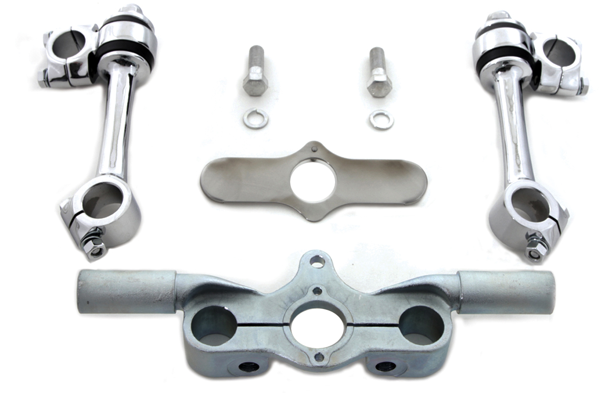 Kit includes stainless inline triple tree cover, zinc triple tree, bolts, and chrome 5.5" flander style risers.