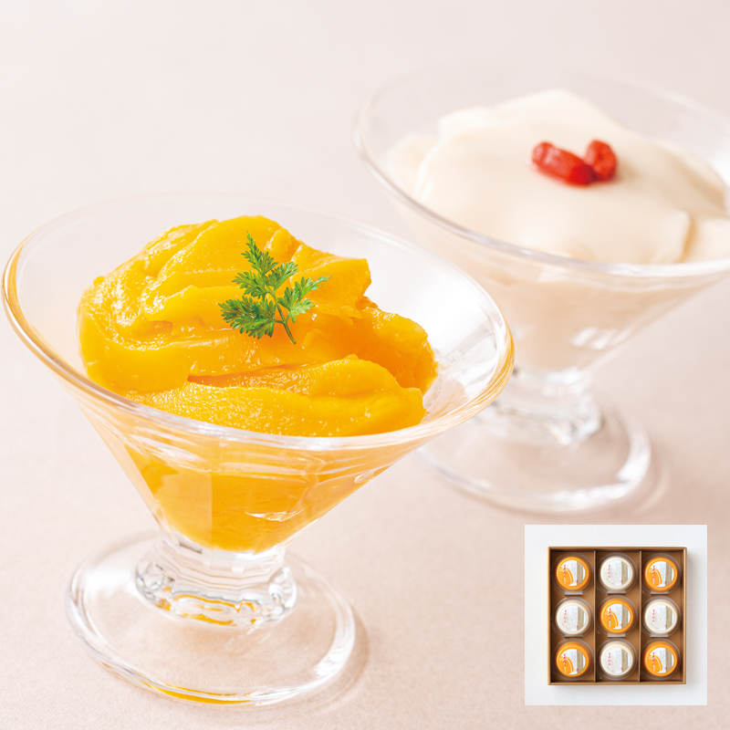 マンゴー果肉がたっぷりのマンゴープリンと、濃厚なミルクに爽やかな杏仁が香る なめらかな口当たりの杏仁プリンのセットです。